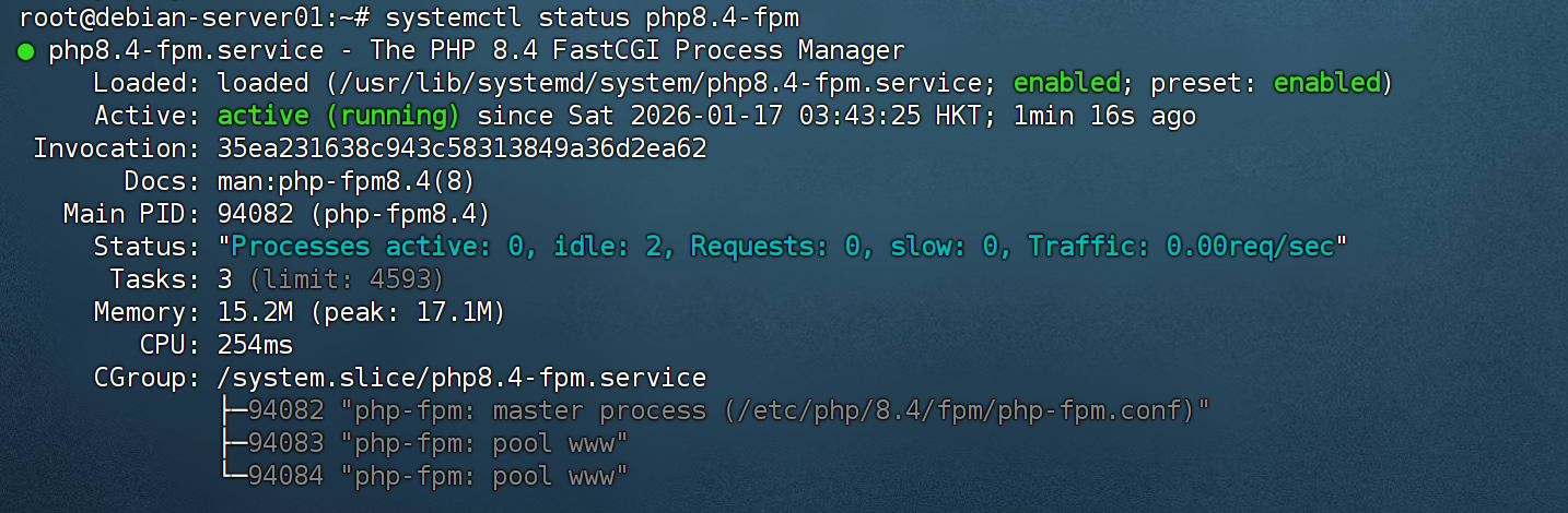 如果系统中安装了 PHP-FPM(FastCGI Process Manager),可以通过以下命令检查其状态:
