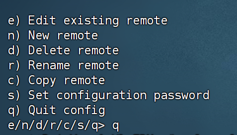 之后输入y 会显示如下选项,再次输入q 退出配置即可。至此我们完成Rclone配置。
